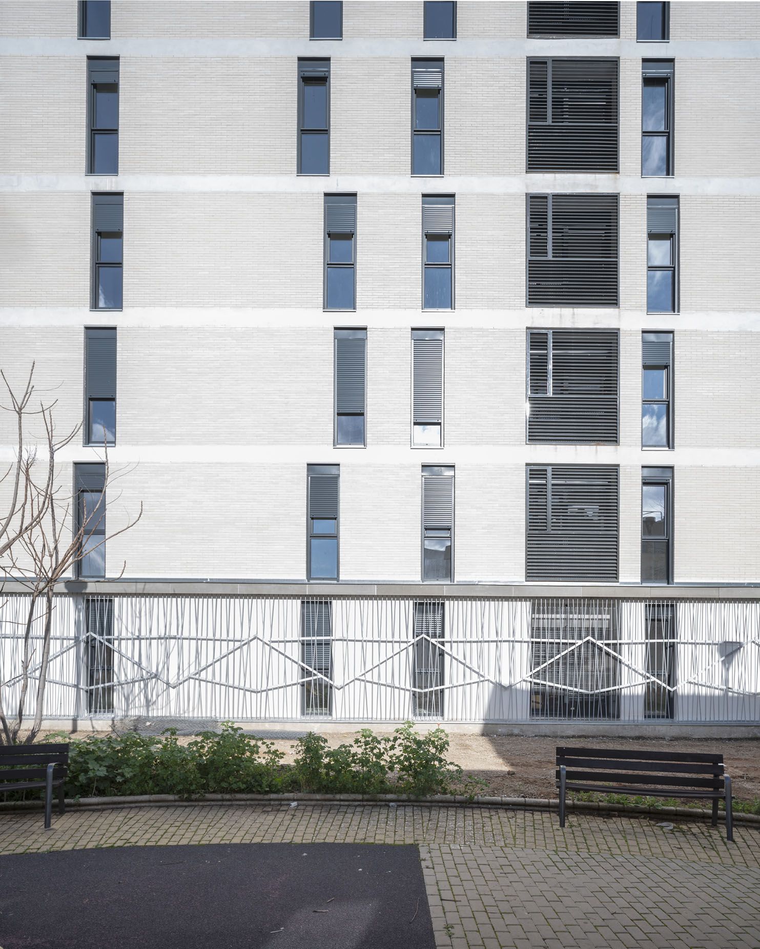 Los colores neutros —gris, beige, blanco y negro— refuerzan el carácter equilibrado y atemporal del conjunto. El bloque se distribuye en cuatro viviendas por planta, todas de tres dormitorios, cocina, baño y salón-comedor, con una superficie útil de 80 m². En la planta baja, una vivienda adaptada para personas con movilidad reducida dispone de dos dormitorios, garantizando la accesibilidad y la inclusión del portal.