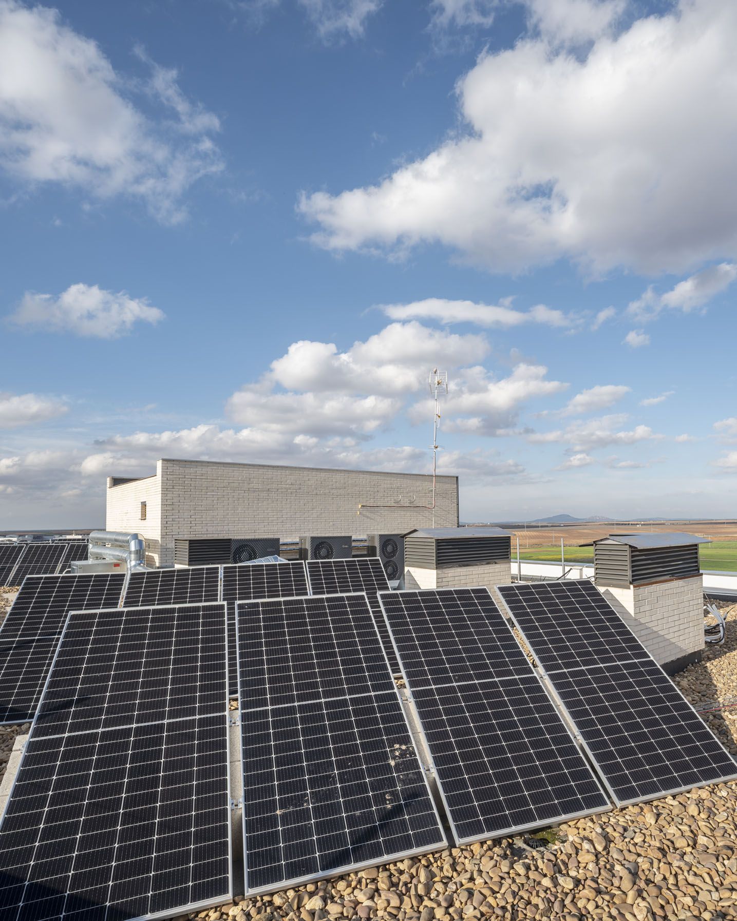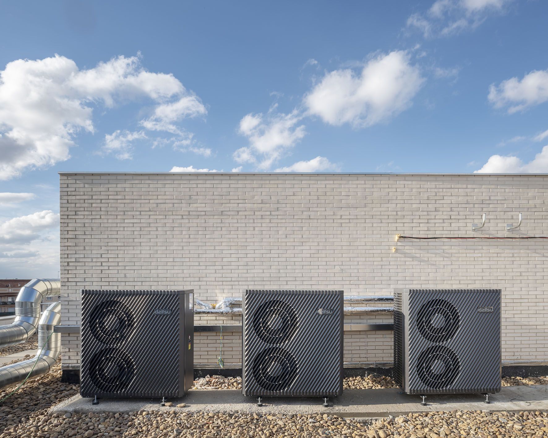 El conjunto se caracteriza por un diseño contemporáneo y una cuidada atención a la eficiencia energética, alcanzada mediante una fuerte envolvente térmica y la incorporación de sistemas de aerotermia comunitaria para la producción de agua caliente sanitaria (ACS), complementada con instalación fotovoltaica.