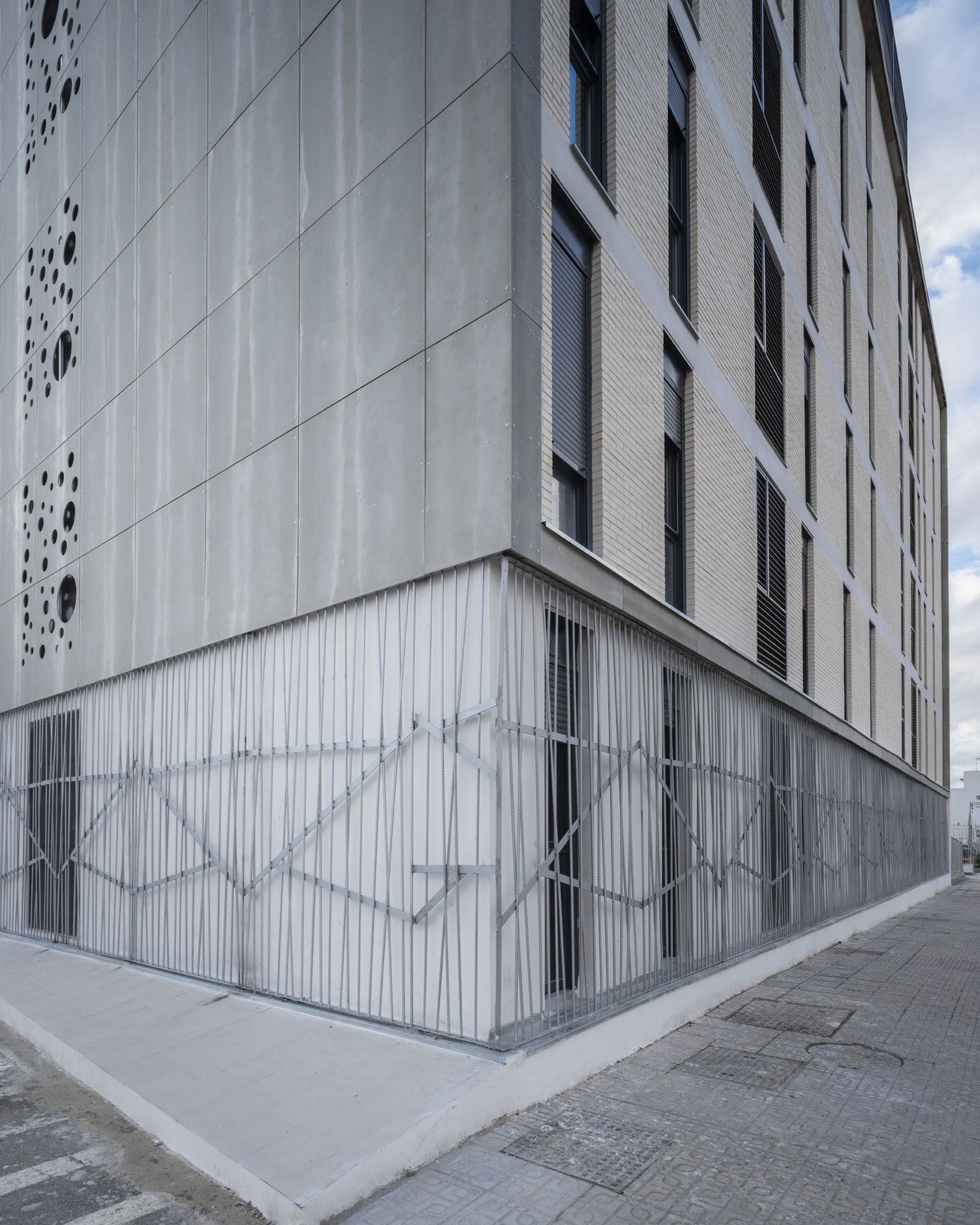 La fachada presenta un lenguaje arquitectónico sobrio y elegante, con paneles prefabricados perforados que aportan profundidad, textura y un juego cambiante de luces interiores, además de rejas de planta baja con diseño artístico y funcional que contribuyen a la identidad del edificio.