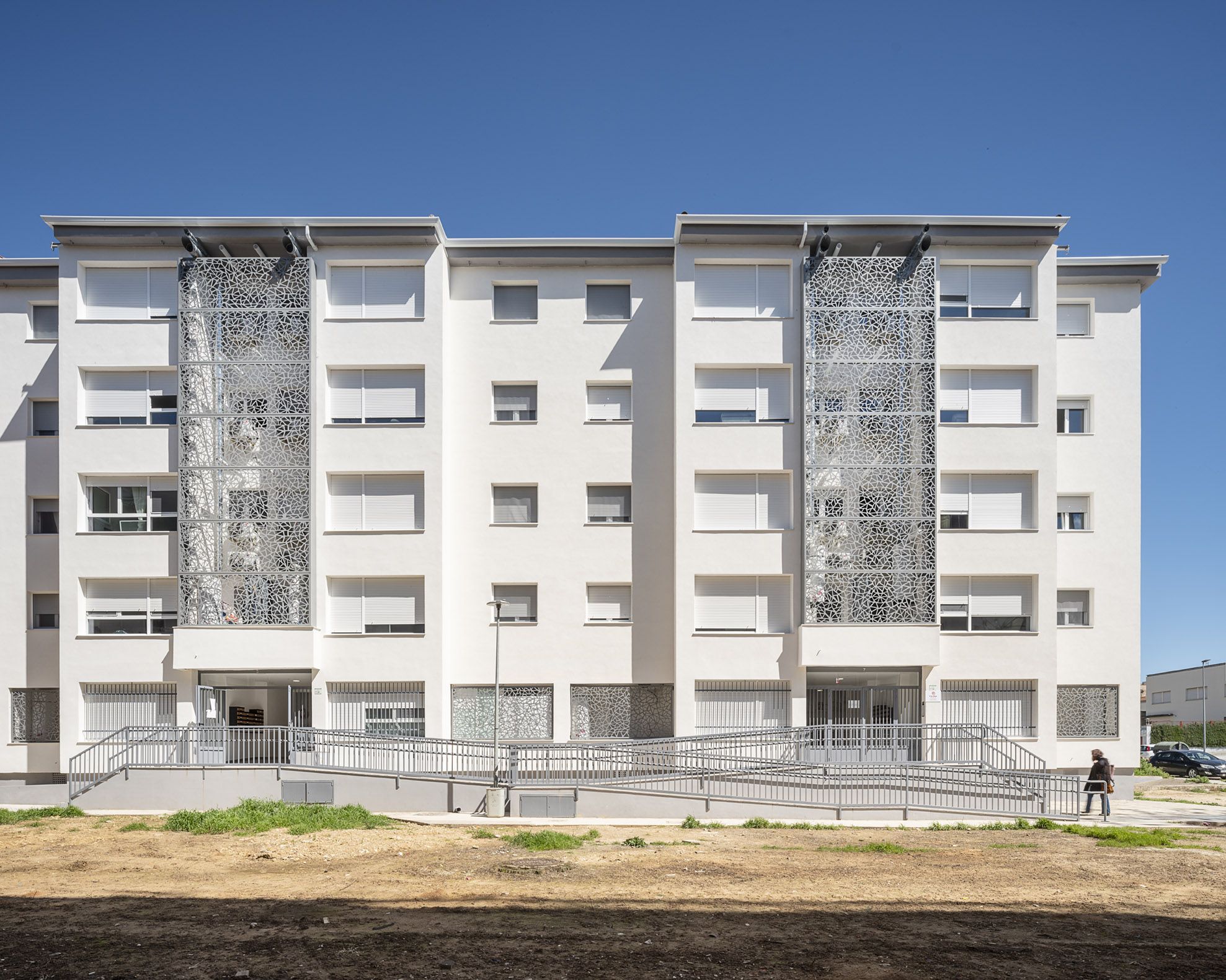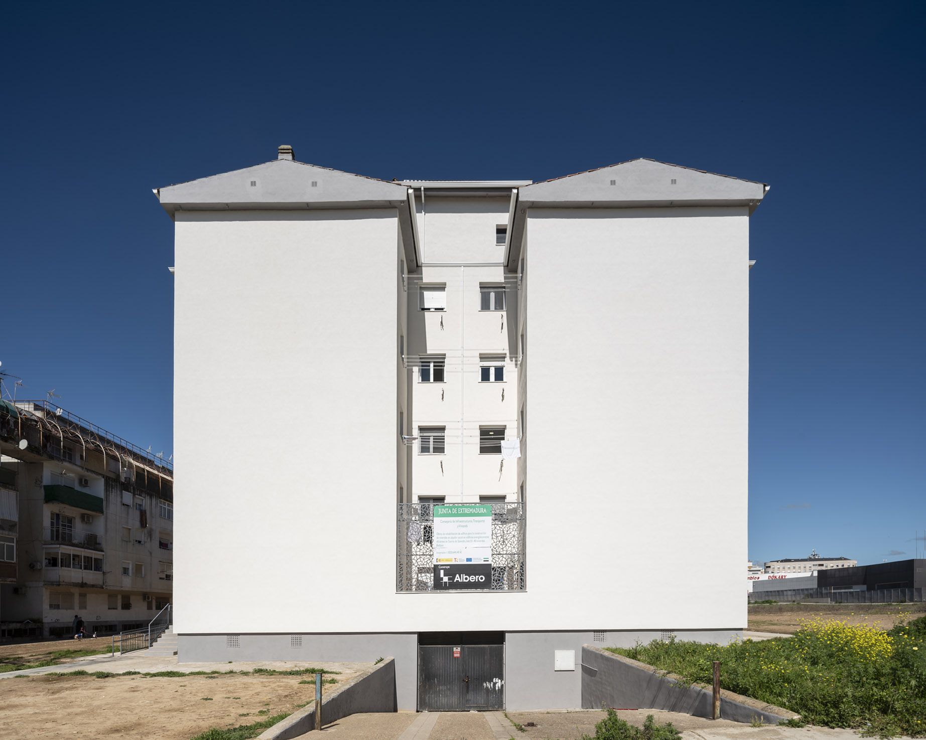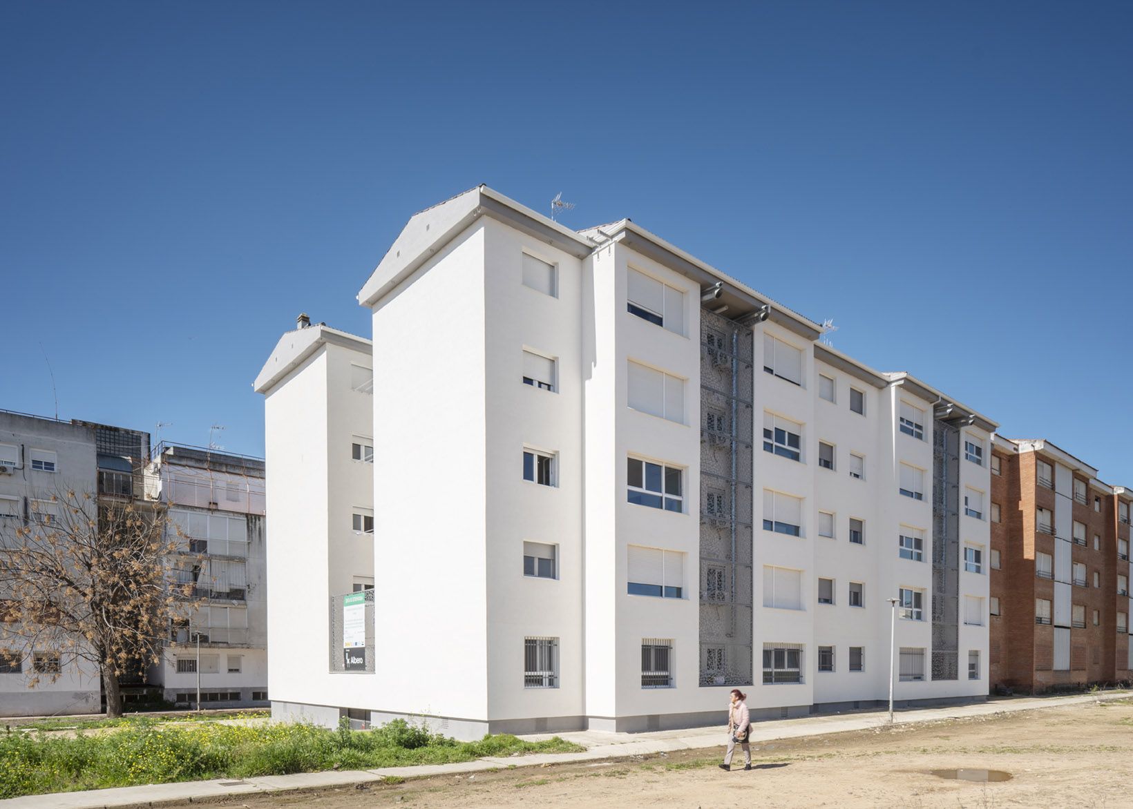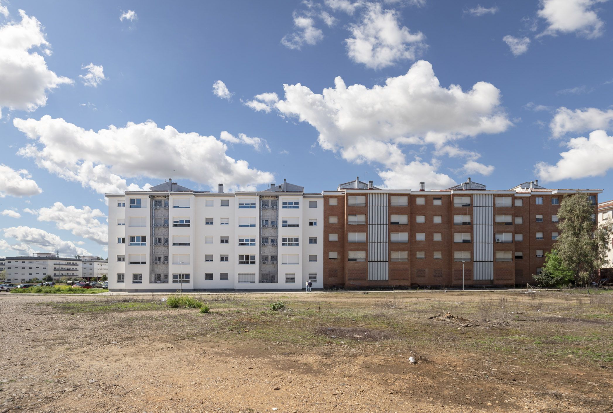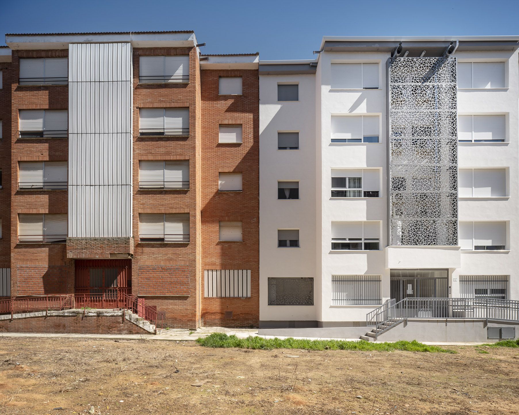 En el barrio de Suerte Saavedra, Badajoz, llevamos a cabo una intervención integral sobre un conjunto residencial de 40 viviendas destinadas a alquiler social, con el objetivo de mejorar la eficiencia energética y la accesibilidad del edificio, y renovar su imagen urbana y dotar de una vivienda digna a personas con riesgo de exclusión social. La actuación fue promovida por la Consejería de Infraestructura, Transporte y Vivienda de la Junta de Extremadura.