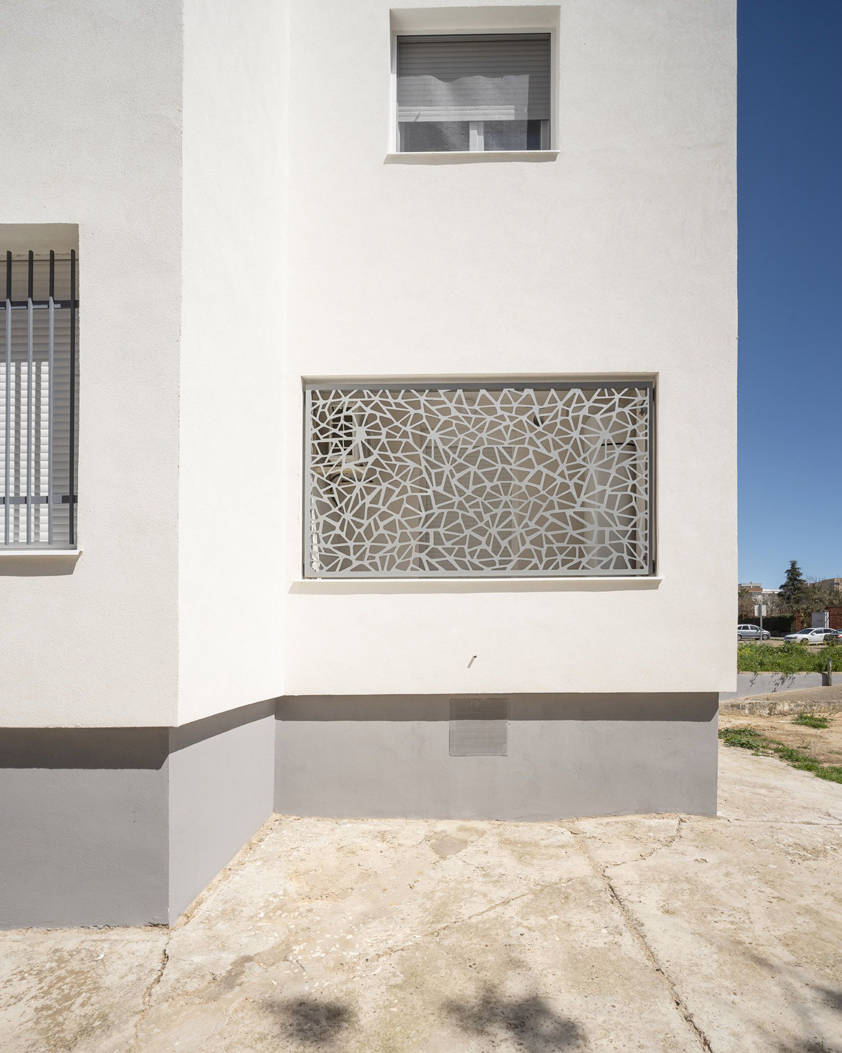 Uno de los elementos más representativos de la intervención es la celosía metálica con diseño orgánico que acompaña los núcleos verticales. Esta pieza, diseñada en nuestro estudio y fabricada con nuestra máquina de corte láser a partir de un patrón en 2D, cumple una doble función: actúa como filtro visual para ocultar los equipos de climatización y, al mismo tiempo, proporciona protección solar a los huecos tras ella.